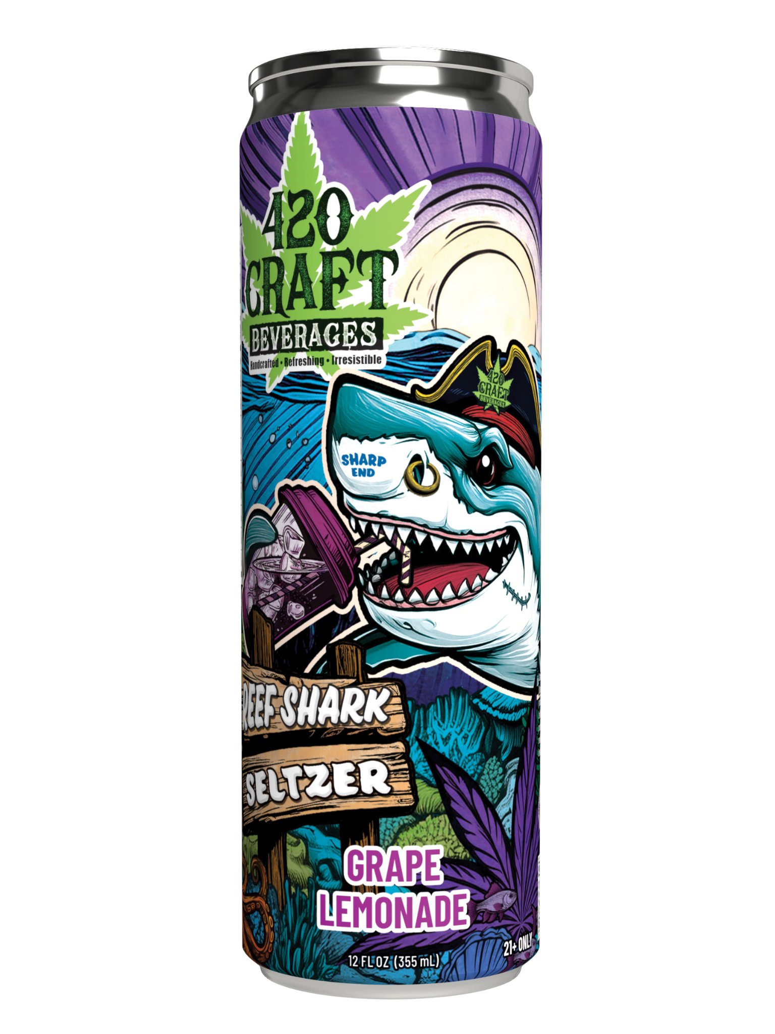 Cannabis-infused sparkling seltzer with grape lemonade flavor, an alternative to sugary sodas